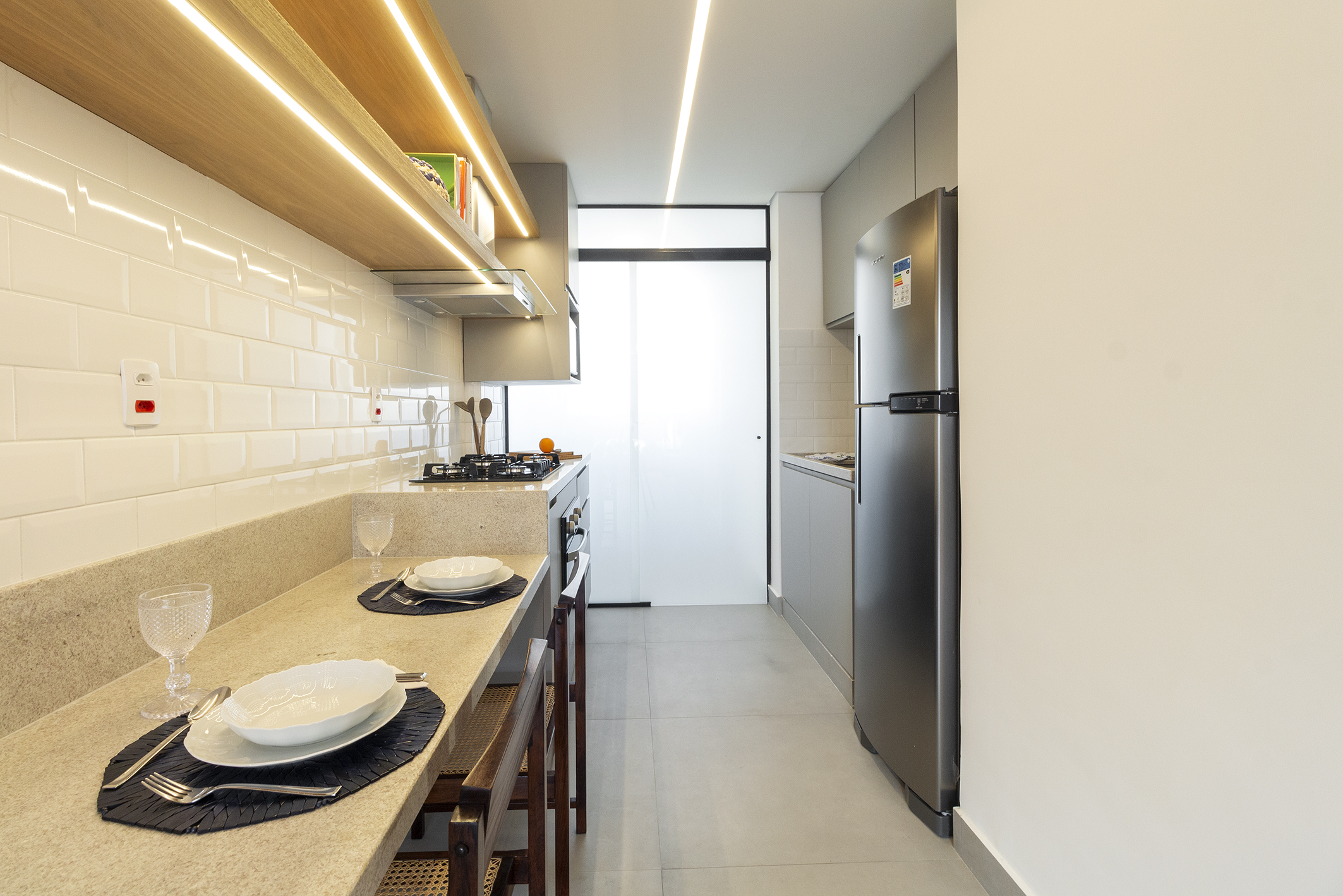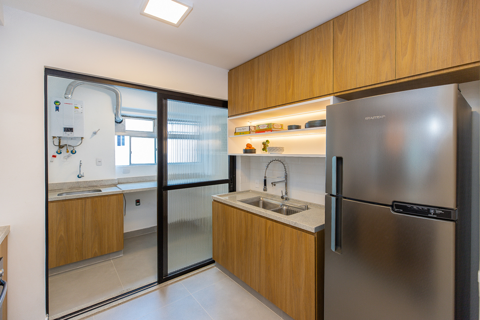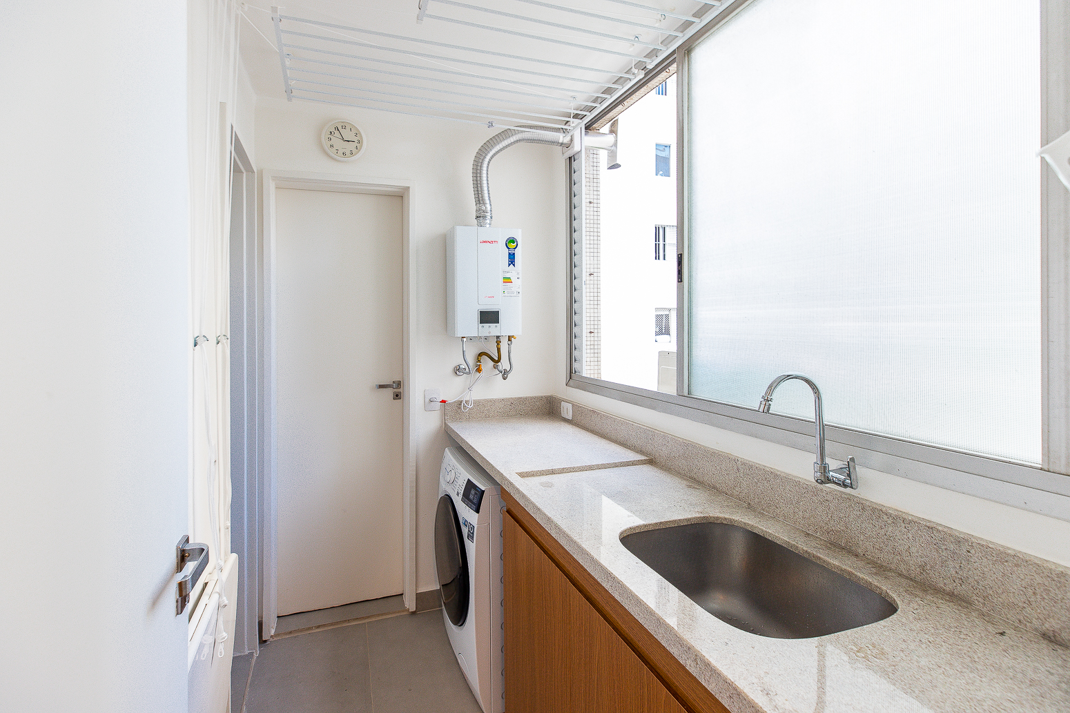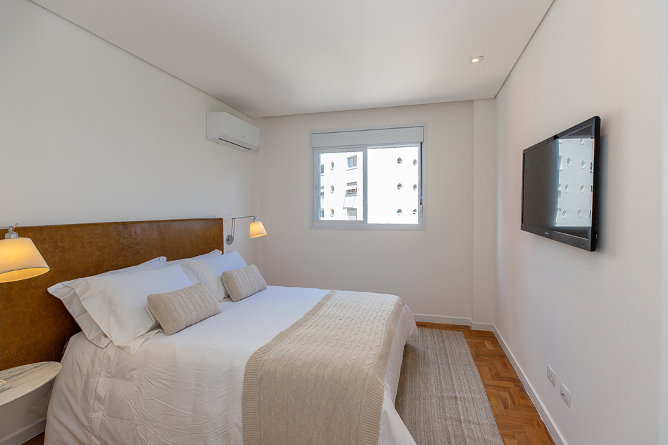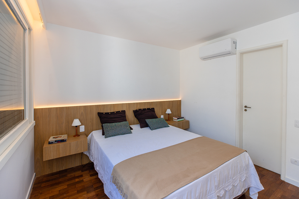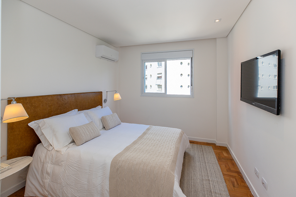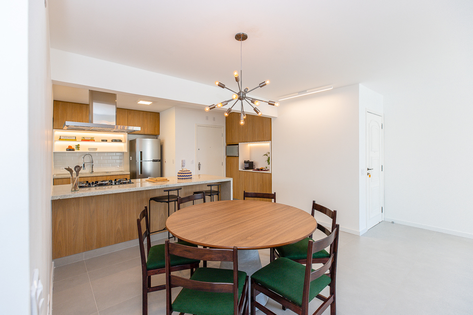 Mobiliado; Equipado com eletrodomésticos; Ar condicionado em todos os ambientes; Cozinha americana; sala de jantar, sala de TV, Quarto amplo, bem iluminado, armários personalizados nos dois quartos principais, deposito, WC de serviço;